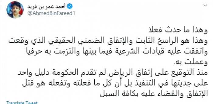 وأضاف: "منذ التوقيع على اتفاق الرياض لم تقدم الحكومة دليل واحد على جديتها في التنفيذ بل أن كل ما فعلته وتفعله هو قتل الاتفاق والقضاء عليه بكافة السبل".