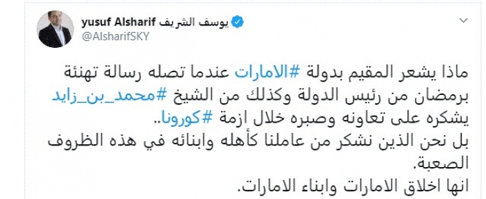 وقال في تغريدة عبر "تويتر" رصدها "المشهد العربي": "ماذا يشعر المقيم بدولة الإمارات عندما تصله رسالة تهنئة برمضان من رئيس الدولة وكذلك من الشيخ محمد بن زايد يشكره على تعاونه وصبره خلال أزمة كورونا.. بل نحن الذين نشكر من عاملنا كأهله وأبنائه في هذه الظروف الصعبة. إنها أخلاق الإمارات وأبناء الإمارات".