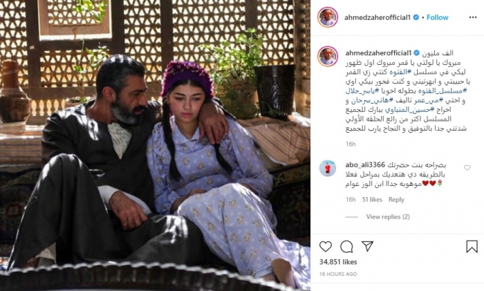 ونشر زاهر، صورة لابنته مع ياسر جلال عبر حسابه على انستجرام، وعلق: "ألف مليون مبروك يا لولتي يا قمر، مبروك أول ظهور ليكي في مسلسل الفتوة.. كنتي زي القمر يا حبيبتي".