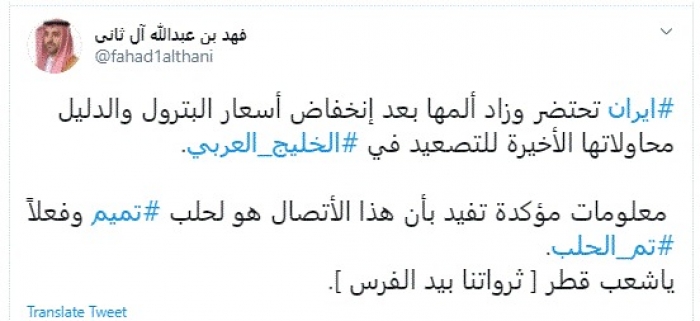 وكتب في تغريدة عبر "تويتر" رصدها "المشهد العربي": "إيران تحتضر وزاد ألمها بعد انخفاض أسعار البترول والدليل محاولاتها الأخيرة للتصعيد في الخليج العربي. معلومات مؤكدة تفيد بأن هذا الاتصال هو لحلب تميم وفعلاً تم الحلب. يا شعب قطر [ثرواتنا بيد الفرس]".