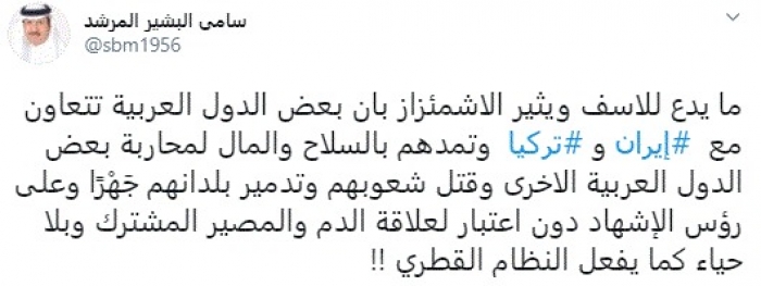 وقال في تغريدة عبر "تويتر" رصدها "المشهد العربي": "ما يدع للأسف ويثير الاشمئزاز بأن بعض الدول العربية تتعاون مع إيران وتركيا وتمدهم بالسلاح والمال لمحاربة بعض الدول العربية الأخرى وقتل شعوبهم وتدمير بلدانهم جَهْرًا وعلى رؤس الإشهاد دون اعتبار لعلاقة الدم والمصير المشترك وبلا حياء كما يفعل النظام القطري".