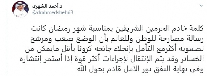 وقال في تغريدة عبر "تويتر" رصدها "المشهد العربي": "كلمة خادم الحرمين الشريفين بمناسبة شهر رمضان كانت رسالة مصارحة للوطن وللعالم بأن الوضع صعب ومرشح لصعوبة أكثرمع التأمل بإنجلاء جائحة كرونا بأقل مايمكن من الخسائر وقد يتم الانتقال لإجراءات أكثر قوة إذا استمر انتشاره وفي نهاية النفق نور الأمل قادم بحول الله".
