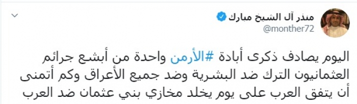 غرد المدون السعودي البارز منذر آل الشيخ مبارك، اليوم الجمعة، في ذكرى إبادة الأرمن والتي قام بها الأتراك، مطالبا الدول العربية بضرورة إبراز مجازر العثمانيين.