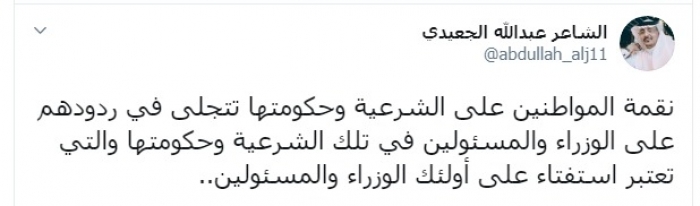 وكتب عبر تغريدة له على "تويتر" رصدها " المشهد العربي":"نقمة المواطنين على الشرعية وحكومتها تتجلى في ردودهم على الوزراء والمسئولين في تلك الشرعية وحكومتها والتي تعتبر استفتاء على أولئك الوزراء والمسئولين".