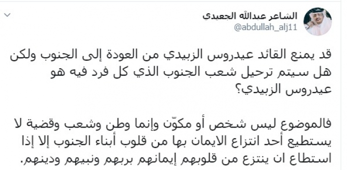 وكتب الجعيدي عبر تغريدة له على "تويتر" رصدها " المشهد العربي":"قد يمنع القائد عيدروس الزُبيدي من العودة إلى الجنوب ولكن هل سيتم ترحيل شعب الجنوب الذي كل فرد فيه هو عيدروس الزُبيدي؟".