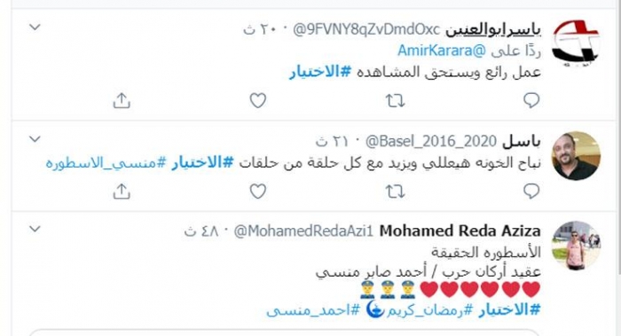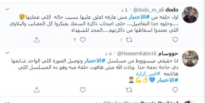 فيما علق شخص اأخر: " أنا حقيقي مبسوووط من مسلسل الاختيار وتوصيل الصورة اللي الواحد شايفها دي حاجة تحفة جدا، وباذن الله مش هافوت حلقة منه وهو ده المسلسل اللي هاتابعه".