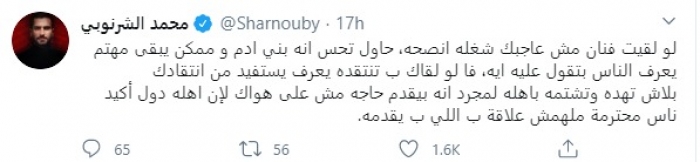وكتب الشرنوبي، عبر حسابه على تويتر، قائلا: "لو لقيت فنان مش عاجبك شغله انصحه، حاول تحس انه بني آدم وممكن يبقى مهتم يعرف الناس بتقول عليه ايه، لو لقاك بتنتقده يعرف يستفيد من انتقاد".
