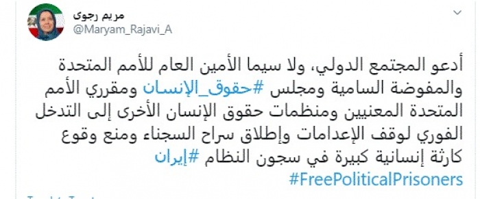 دعت زعيمة المعارضة الإيرانية مريم رجوي، اليوم، المجتمع الدولي بالتدخل الفوري لوقف الإعدامات وإطلاق سراح السجناء ومنع وقوع كارثة إنسانية كبيرة في سجون النظام الإيراني.