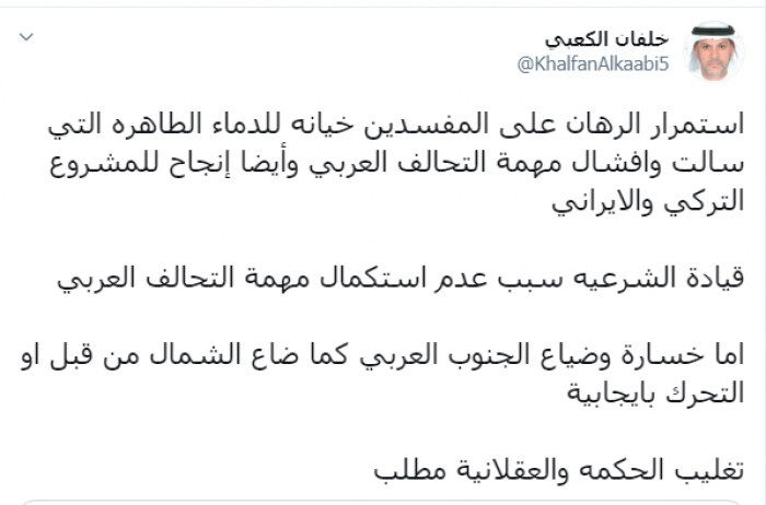 وكتب الكعبي عبر تغريدة له على "تويتر" رصدها " المشهد العربي":"استمرار الرهان على المفسدين خيانة للدماء الطاهرة التي سالت وإفشال مهمة التحالف العربي وأيضا إنجاح للمشروع التركي والإيراني، قيادة الشرعية سبب عدم استكمال مهمة التحالف العربي".
