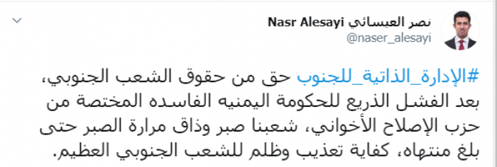 وكتب العيسائي عبر تغريدة له على "تويتر" رصدها " المشهد العربي":"الإدارة الذاتية للجنوب حق من حقوق الشعب الجنوبي، بعد الفشل الذريع للحكومة اليمنية الفاسدة المختصة من حزب الإصلاح الإخواني".