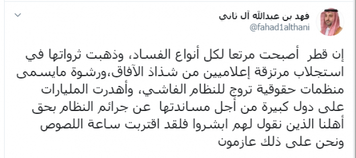 وكتب آل ثاني عبر تغريدة له على "تويتر" رصدها " المشهد العربي":"إن قطر أصبحت مرتعا لكل أنواع الفساد، وذهبت ثرواتها في استجلاب مرتزقة إعلاميين من شذاذ الآفاق،ورشوة مايسمى منظمات حقوقية تروج للنظام الفاشي".