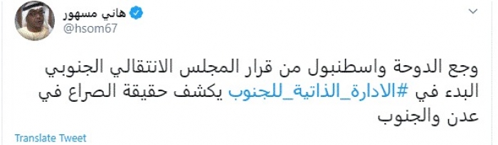 وقال في تغريدة عبر "تويتر" رصدها "المشهد العربي": "وجع الدوحة وإسطنبول من قرار المجلس الانتقالي الجنوبي البدء في الإدارة الذاتية للجنوب يكشف حقيقة الصراع في عدن والجنوب".