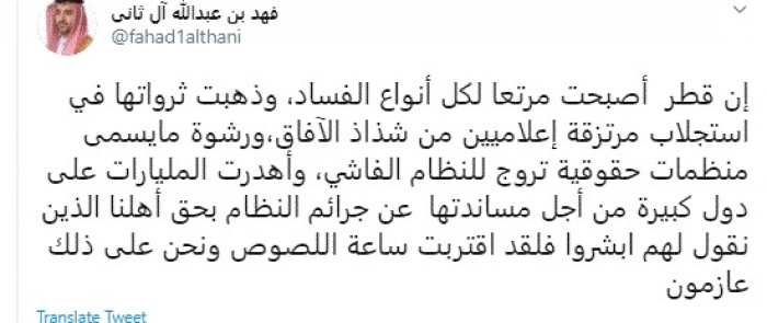 وكتب في تغريدة عبر "تويتر" رصدها "المشهد العربي": "إن قطر أصبحت مرتعًا لكل أنواع الفساد، وذهبت ثرواتها في استجلاب مرتزقة إعلاميين من شذاذ الآفاق".