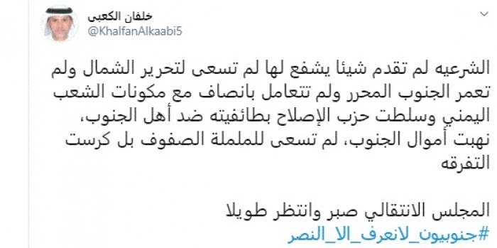 وقال في تغريدة عبر "تويتر" رصدها "المشهد العربي": "الشرعية لم تقدم شيئًا يشفع لها لم تسعى لتحرير الشمال ولم تعمر الجنوب المحرر ولم تتعامل بإنصاف مع مكونات الشعب اليمني وسلطت حزب الإصلاح بطائفيته ضد أهل الجنوب، نهبت أموال الجنوب، لم تسعى للململة الصفوف بل كرست التفرقة.. المجلس الانتقالي صبر وانتظر طويلاً".