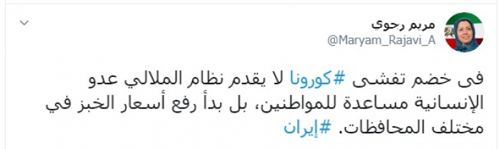 وكتبت رجوي في تغريدة لها على "تويتر" رصدها " المشهد العربي":"فی خضم تفشی کورونا لا يقدم نظام الملالي عدو الإنسانية مساعدة للمواطنين، بل بدأ رفع أسعار الخبز في مختلف المحافظات".