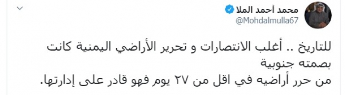 وكتب عبر تغريدة له على "تويتر" رصدها " المشهد العربي":" للتاريخ، أغلب الانتصارات و تحرير الأراضي اليمنية كانت بصمتها جنوبية"