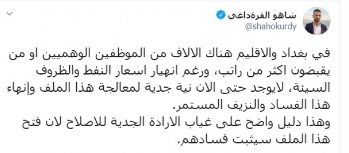 وكتب في تغريدة له على "تويتر" رصدها " المشهد العربي":"في بغداد والإقليم هناك الآلاف من الموظفين الوهميين أو من يقبضون أكثر من راتب، ورغم انهيار أسعار النفط والظروف السيئة، لا يوجد حتى الآن نية جدية لمعالجة هذا الملف وإنهاء هذا الفساد والنزيف المستمر".
