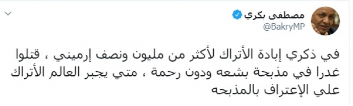 وكتب بكري عبر تغريدة له على "تويتر" رصدها " المشهد العربي":"في ذكري إبادة الأتراك لأكثر من مليون ونصف أرميني ، قتلوا غدرا في مذبحة بشعة ودون رحمة".