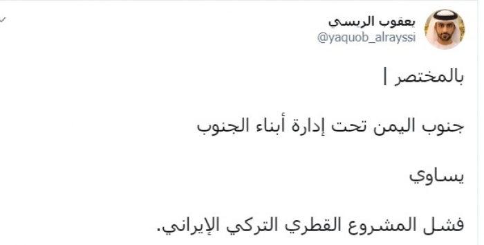 أكد الكاتب الإماراتي يعقوب الريسي، اليوم الأحد، أن بيان فرض الإدارة الذاتية للجنوب العربي هو تأكيد على فشل المشروع القطري التركي الإيراني في الجنوب