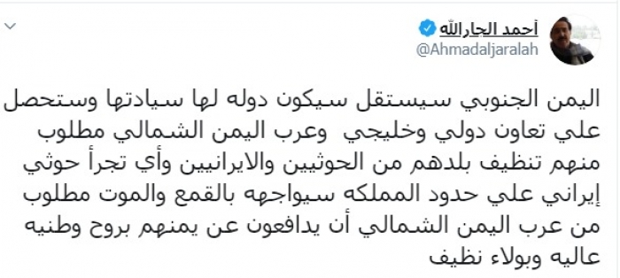 وكتب الجارالله عبر تغريدة له على "تويتر" رصدها " المشهد العربي":"اليمن الجنوبي سيستقل سيكون دولة لها سيادتها وستحصل على تعاون دولي وخليجي".