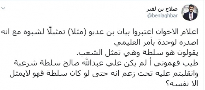 وكتب بن لغبر عبر تغريدة له على "تويتر" رصدها " المشهد العربي":" إعلام الإخوان اعتبروا بيان بن عديو (مثلا) تمثيلًا لشبوة مع أنه أصدره لوحده بأمر العليمي يقولون هو سلطة وهي تمثل الشعب".