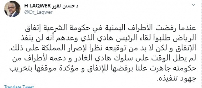 وأضاف: "لم يطل الوقت على سلوك هادي الغادر ودعمه لأطراف من حكومته جاهرت علنًا برفضها للاتفاق ومؤكدة موقفها بتخريب جهود تنفيذه".