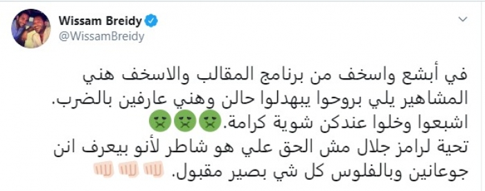 وكتب وسام بريدي: "في أبشع وأسخف من برنامج المقالب والأسخف هنا المشاهير اللي بيروحوا يبهدلوا حالهم وهما عارفين بالضرب، اشبعوا وخلوا عندكم شوية كرامة، تحية لرامز جلال مش الحق عليه هو شاطر لأن بيعرف اننا جوعانين وبالفلوس كل شي بيصير مقبول.