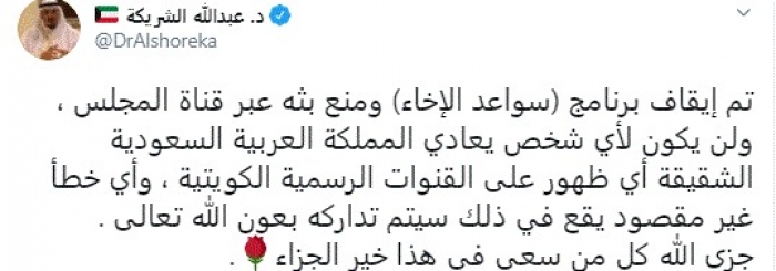 وقال في تغريدة عبر "تويتر" رصدها "المشهد العربي": "تم إيقاف برنامج (سواعد الإخاء) ومنع بثه عبر قناة المجلس، ولن يكون لأي شخص يعادي المملكة العربية السعودية الشقيقة أي ظهور على القنوات الرسمية الكويتية، وأي خطأ غير مقصود يقع في ذلك سيتم تداركه بعون الله تعالى. جزى الله كل من سعى في هذا خير الجزاء".