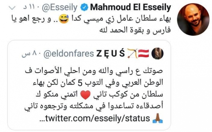 جاء ذلك ردا على أحد متابعه على تويتر، والذي قال له: "صوتك على راسي والله ومن أحلى الأصوات في الوطن العربي وفي التوب 5 كمان، لكن بهاء سلطان من كوكب تاني.. أتمنى منكوا كأصدقاء تساعدوه في مشكلته وترجعوه تاني".