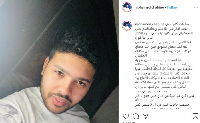ونشر شاهين صورة، عبر حسابه الرسمي بموقع "إنستجرام"، وعلق عليها: "ساعات كتير قوي بقعد افكر في كلامكم وتعليقاتكم علي السوشيال ميديا كلها ليا وعلي فكرة الكلام بيأثر فيا قوي لما الاقي الناس بتقولي أنت فين مختفي ليه أنت محتاج تسويق صح أنت محتاج شركة إنتاج كبيرة تعرف تحطك في مكانك الحقيقي، أنا اَسف ان البوست طويل شوية".