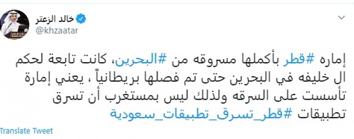 وكتب في تغريدة عبر "تويتر" رصدها "المشهد العربي": "إمارة قطر بأكملها مسروقة من البحرين، كانت تابعة لحكم آل خليفة في البحرين حتى تم فصلها بريطانياً، يعني إمارة تأسست على السرقه ولذلك ليس بمستغرب أن تسرق تطبيقات قطر تسرق تطبيقات سعودية".