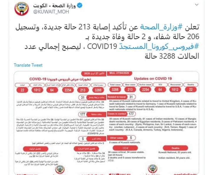 أعلنت وزارة الصحة الكويتية، اليوم، تسجيل إصابة 213 حالة جديدة بفيروس كورونا، ووفاة حالتين، مؤكدةً أن إجمالي عدد الحالات ارتفع إلى 3288.