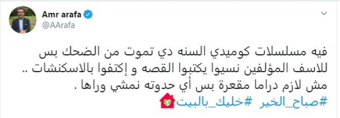 وكتب عرفة، عبر حسابه على تويتر، قائلا : "فيه مسلسلات كوميدي السنة دي تموت من الضحك، بس للأسف المؤلفين نسيوا يكتبوا القصة واكتفوا بالاسكتشات .. مش لازم دراما مقعرة بس أي حدوتة نمشي وراها".