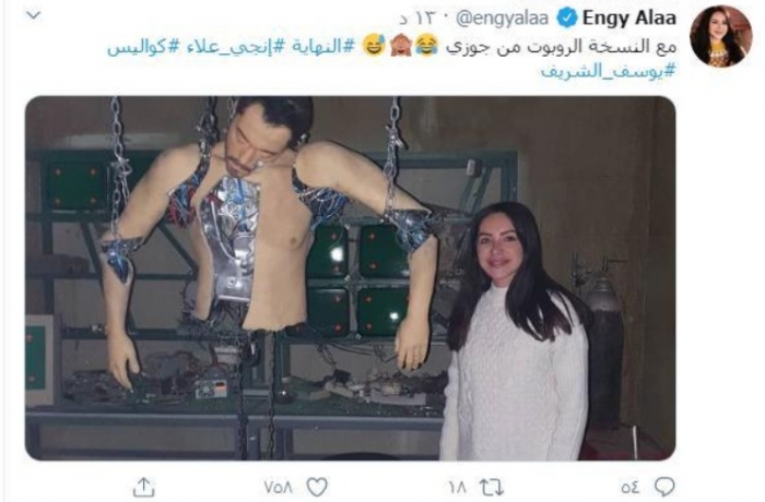 وظهرت إنجي بجوار الروبوت زين، وعلقت على الصورة: "مع النسخة الروبوت من جوزي، من كواليس مسلسل النهاية".