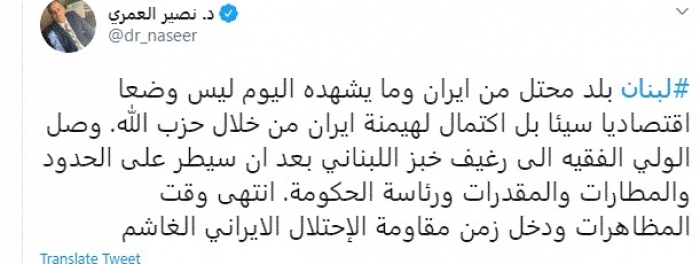 وقال في تغريدة عبر "تويتر" رصدها "المشهد العربي": "لبنان بلد محتل من إيران وما يشهده اليوم ليس وضعا اقتصاديا سيئا بل اكتمال لهيمنة إيران من خلال حزب الله".