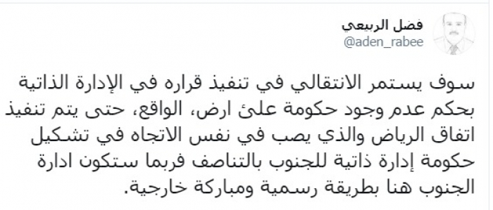 وكتب عبر تغريدة له على "تويتر" رصدها " المشهد العربي":"سوف يستمر الانتقالي في تنفيذ قراره في الإدارة الذاتية بحكم عدم وجود حكومة على أرض الواقع، حتى يتم تنفيذ اتفاق الرياض".