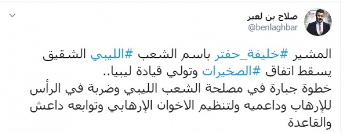 وكتب بن لغبر عبر تغريدة له على "تويتر" رصدها " المشهد العربي":"المشير خليفة حفتر باسم الشعب الليبي الشقيق يسقط اتفاق الصخيرات وتولي قيادة ليبيا".