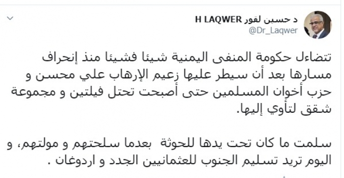 وكتب لقور عبر تغريدة له على "تويتر" رصدها " المشهد العربي":"تتضاءل حكومة المنفى اليمنية شيئا فشيئا منذ انحراف مسارها بعد أن سيطر عليها زعيم الإرهاب علي محسن و حزب إخوان المسلمين حتى أصبحت تحتل فيلتين و مجموعة شقق لتأوي إليها".