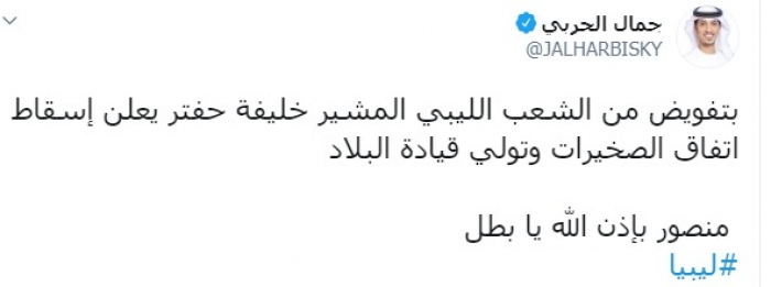 وكتب الحربي عبر تغريدة له على "تويتر" رصدها " المشهد العربي":"بتفويض من الشعب الليبي المشير خليفة حفتر يعلن إسقاط اتفاق الصخيرات وتولي قيادة البلاد".