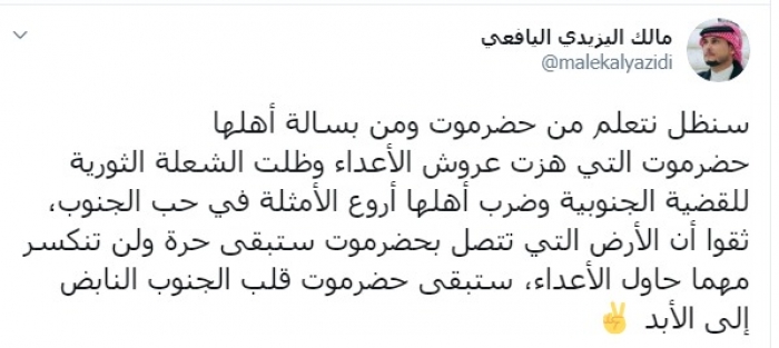 وكتب اليافعي عبر تغريدة له على "تويتر" رصدها " المشهد العربي":"سنظل نتعلم من حضرموت ومن بسالة أهلها، حضرموت التي هزت عروش الأعداء وظلت الشعلة الثورية للقضية الجنوبية وضرب أهلها أروع الأمثلة في حب الجنوب".