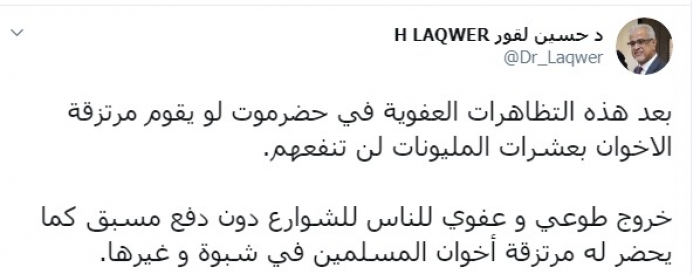 وكتب لقور عبر تغريدة له على "تويتر" رصدها " المشهد العربي":"بعد هذه التظاهرات العفوية في حضرموت لو يقوم مرتزقة الإخوان بعشرات المليونات لن تنفعهم".