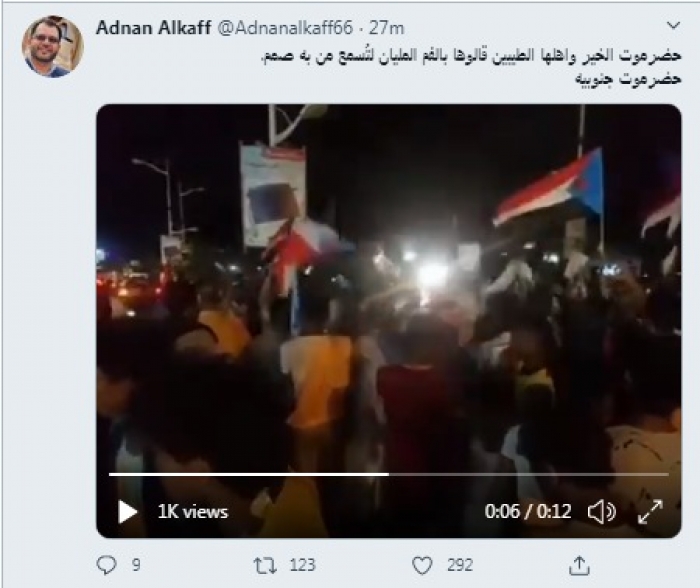 وأرفق بالتغريدة مقطعا مصورا للآلاف من المحتشدين يرددون "حضرموت جنوبية، برا برا يا شرعية".