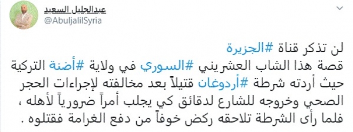 وقال في تغريدة عبر "تويتر" رصدها "المشهد العربي": "لن تذكر قناة الجزيرة قصة هذا الشاب العشريني السوري في ولاية أضنة التركية حيث أردته شرطة أردوغان قتيلاً بعد مخالفته لإجراءات الحجر الصحي وخروجه للشارع لدقائق كي يجلب أمراً ضرورياً لأهله، فلما رأى الشرطة تلاحقه ركض خوفاً من دفع الغرامة فقتلوه".
