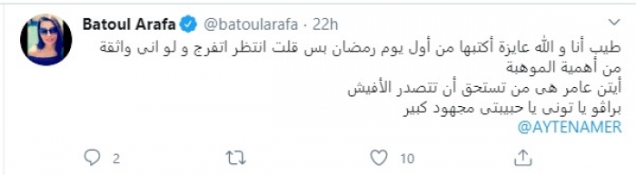وكتبت "بتول" عبر حسابها الرسمي بموقع تويتر: "طيب أنا والله عايزة أكتبها من أول يوم رمضان، بس قلت أنتظر أتفرج و لو إني واثقة من أهمية الموهبة، أيتن عامر هي من تستحق أن تتصدر الأفيش، براڤو يا تونى يا حبيبتي مجهود كبير".