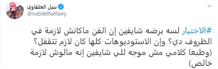 كتب الحلفاوي تغريدة، عبر حسابه الرسمي بموقع "تويتر"، :" الاختيار، لسه برضه شايفين إن الفن ماكانش له لازمة في الظروف دي؟ وإن الاستوديوهات كلها كان لازم تتقفل؟، (وطبعا كلامي مش موجه للي شايفين إنه مالوش لازمة خالص)".