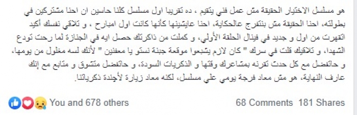وكتبت إسعاد يونس عبر حسابها على "فيسبوك": "هو مسلسل الاختيار الحقيقة مش عمل فني يتقيم، ده تقريبا أول مسلسل كلنا حاسين إن إحنا مشتركين في بطولته، إحنا الحقيقة مش بنتفرج عالحكاية، إحنا عايشينها كأنها كانت أول امبارح، وتلاقي نفسك أكيد اتقهرت من أول وجديد في فينال الحلقة الأولي، وكملت من ذاكرتك حصل إيه في الجنازة لما رحت تودع الشهدا، وتلاقيك قلت في سرك " كان لازم يشبعوا موقعة جبنة نستو يا معفنين" لأنك لسه مغلول من يومها، وحاتفضل مع كل حدث تقرنه بمشاعرك وقتها والذكريات السودة، و حاتفضل متشوق ومتابع مع إنك عارف النهاية، هو مش معاد فرجة يومي علي مسلسل، لكنه معاد زيارة لأچندة ذكرياتنا"