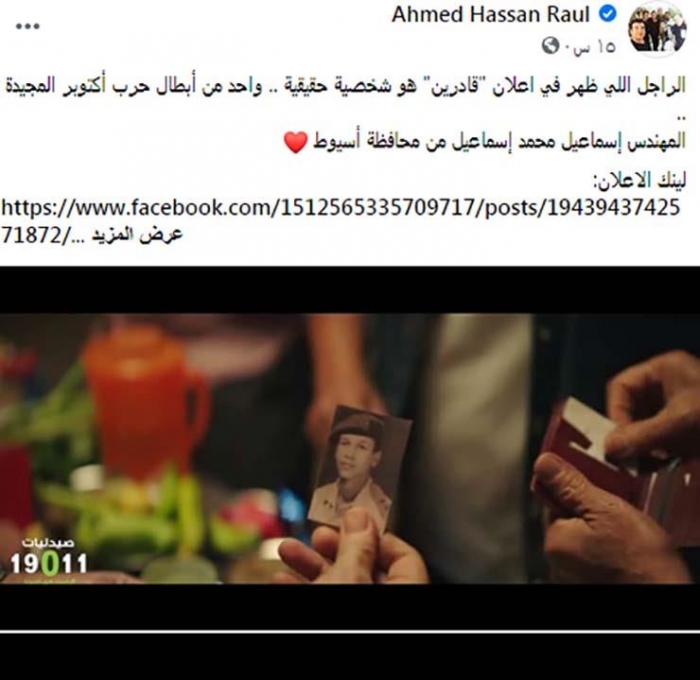راؤول كشف عن ذلك عبر صفحته بموقع فيسبوك: "وكتب "الراجل اللي ظهر في إعلان (قادرين ) هو شخصية حقيقية ،واحد من أبطال حرب أكتوبر المجيدة، المهندس إسماعيل محمد إسماعيل ،من محافظة أسيوط"
