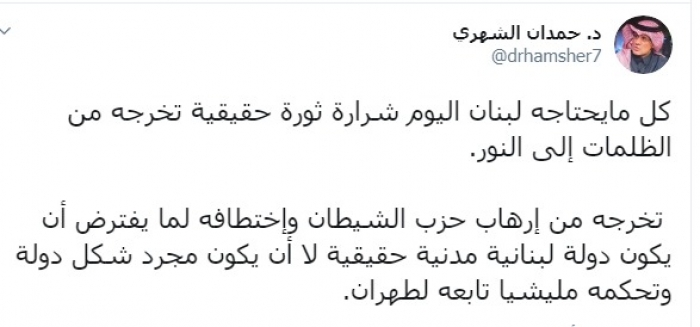 وكتب الشهري عبر تغريدة له على "تويتر" رصدها " المشهد العربي":"كل ما يحتاجه لبنان اليوم شرارة ثورة حقيقية تخرجه من الظلمات إلى النور".