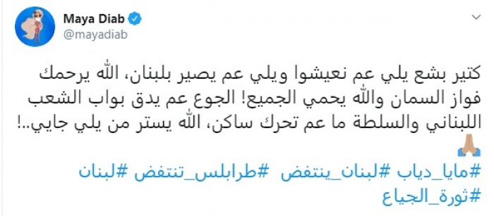 هاجمت الفنانة مايا دياب الأوضاع الراهنة في لبنان، بسبب تردي الأوضاع الاقتصادية، ووفاة شاب خلال مواجهات مع الجيش اللبناني.