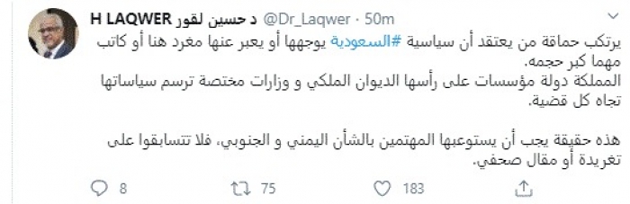 وقال في تغريدة عبر "تويتر" رصدها "المشهد العربي": "يرتكب حماقة من يعتقد أن سياسية السعودية يوجهها أو يعبر عنها مغرد هنا أو كاتب مهما كبر حجمه. المملكة دولة مؤسسات على رأسها الديوان الملكي ووزارات مختصة ترسم سياساتها تجاه كل قضية".